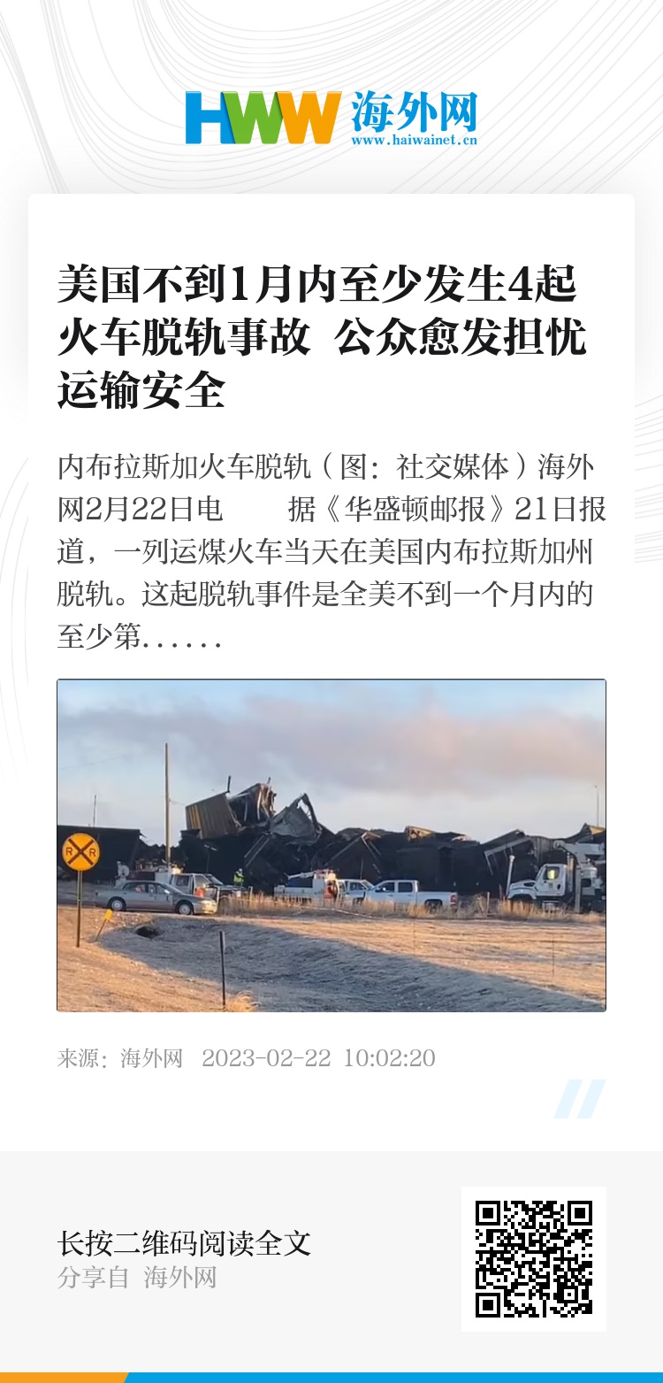 海外网2月22日电 据《华盛顿邮报》21日报道,一列运煤火车当天在美国内布拉斯加州脱轨。这起脱轨事件是全美不到一个月内的至少第四次脱轨事故,公众愈发担忧运输安全性对健康造成的隐患。