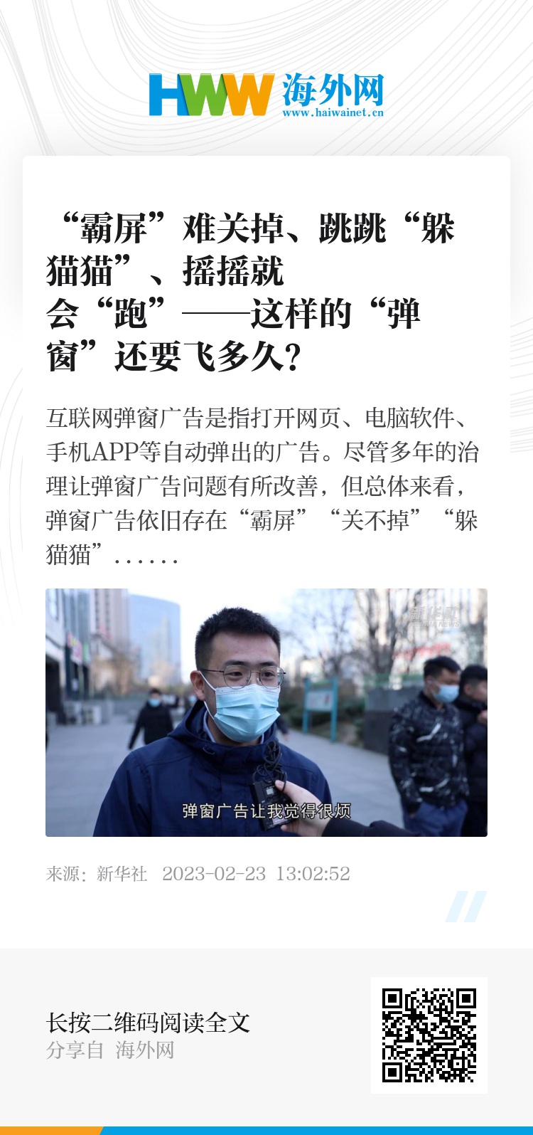互联网弹窗广告是指打开网页、电脑软件、手机APP等自动弹出的广告。尽管多年的治理让弹窗广告问题有所改善,但总体来看,弹窗广告依旧存在“霸屏”“关不掉”“躲猫猫”等现象。