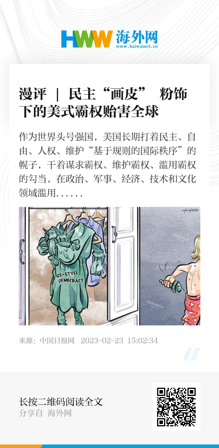 作为世界头号强国,美国长期打着民主、自由、人权、维护“基于规则的国际秩序”的幌子,干着谋求霸权、维护霸权、滥用霸权的勾当,在政治、军事、经济、技术和文化领域滥用霸权,劣迹斑斑,对世界的和平与稳定以及各国人民的福祉构成了严重危害。