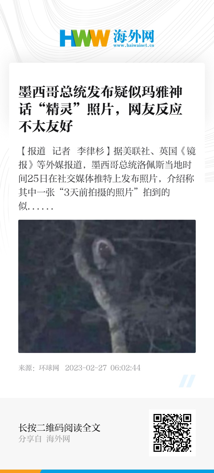 【环球网报道 记者 李律杉】据美联社、英国《镜报》等外媒报道,墨西哥总统洛佩斯当地时间25日在社交媒体推特上发布照片,介绍称其中一张“3天前拍摄的照片”拍到的似乎是玛雅神话中叫做“aluxe”的森林精灵。这一推文引发了一些争议,有网友说,相关图片实际拍摄于2021年。