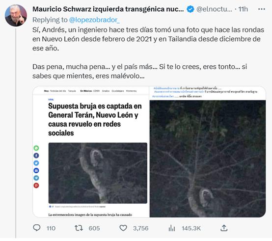 洛佩斯相关推文下方,有网友直接回复、转发称,“是的,安德烈斯(洛佩斯),3天前一位工程师拍了这张照片。但这张照片从2021年2月的新莱昂州开始,到同年12月份的泰国,都有出现过。你好丢人,太丢人了……我们国家最丢人……如果你真信了,那你就是个傻瓜……如果你知道这是假的,那你真是用心险恶……”↓