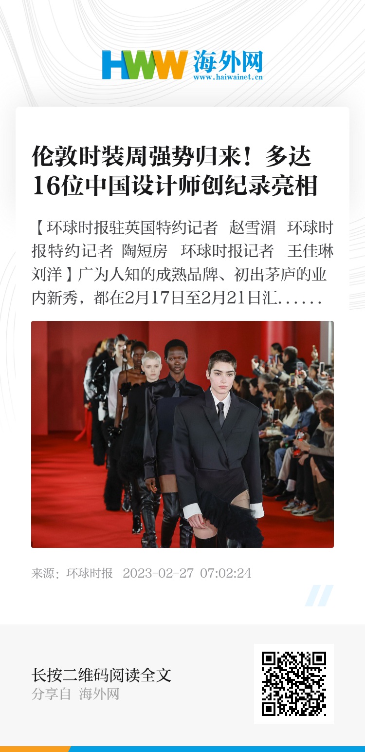 【环球时报驻英国特约记者 赵雪湄 环球时报特约记者 陶短房 环球时报记者 王佳琳 刘洋】广为人知的成熟品牌、初出茅庐的业内新秀,都在2月17日至2月21日汇集于2023年秋冬伦敦时装周的舞台,展示着时尚界对秋冬着装新趋势的理解。伦敦时装周与巴黎时装周、纽约时装周和米兰时装周一起,并称世界“四大时装周”,自1983年举办第一届起,备受媒体、时尚界、专业人士、名流和普通人的瞩目。时装周是时尚界服装设计师以及时尚品牌发布新一季产品的活动,也是全球时尚达人潮聚的盛典。