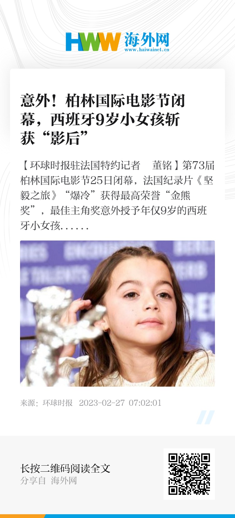 【环球时报驻法国特约记者 董铭】第73届柏林国际电影节25日闭幕,法国纪录片《坚毅之旅》“爆冷”获得最高荣誉“金熊奖”,最佳主角奖意外授予年仅9岁的西班牙小女孩索菲亚·奥特罗,两部中国电影《白塔之光》和《艺术学院》遗憾与奖项擦肩而过。