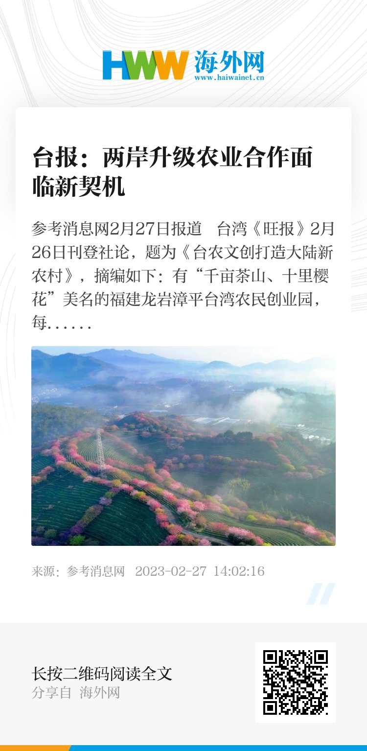参考消息网2月27日报道 台湾《旺报》2月26日刊登社论,题为《台农文创打造大陆新农村》,摘编如下: