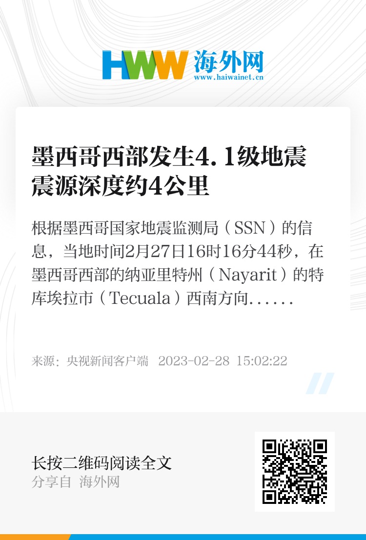 根据墨西哥国家地震监测局(SSN)的信息,当地时间2月27日16时16分44秒,在墨西哥西部的纳亚里特州(Nayarit)的特库埃拉市(Tecuala)西南方向约110公里处发生4.1级地震,震源深度约4公里。墨西哥的地震预警系统没有启动,目前暂无人员伤亡和财产损失的报告。(总台记者 盛嘉迪 吕兴林)