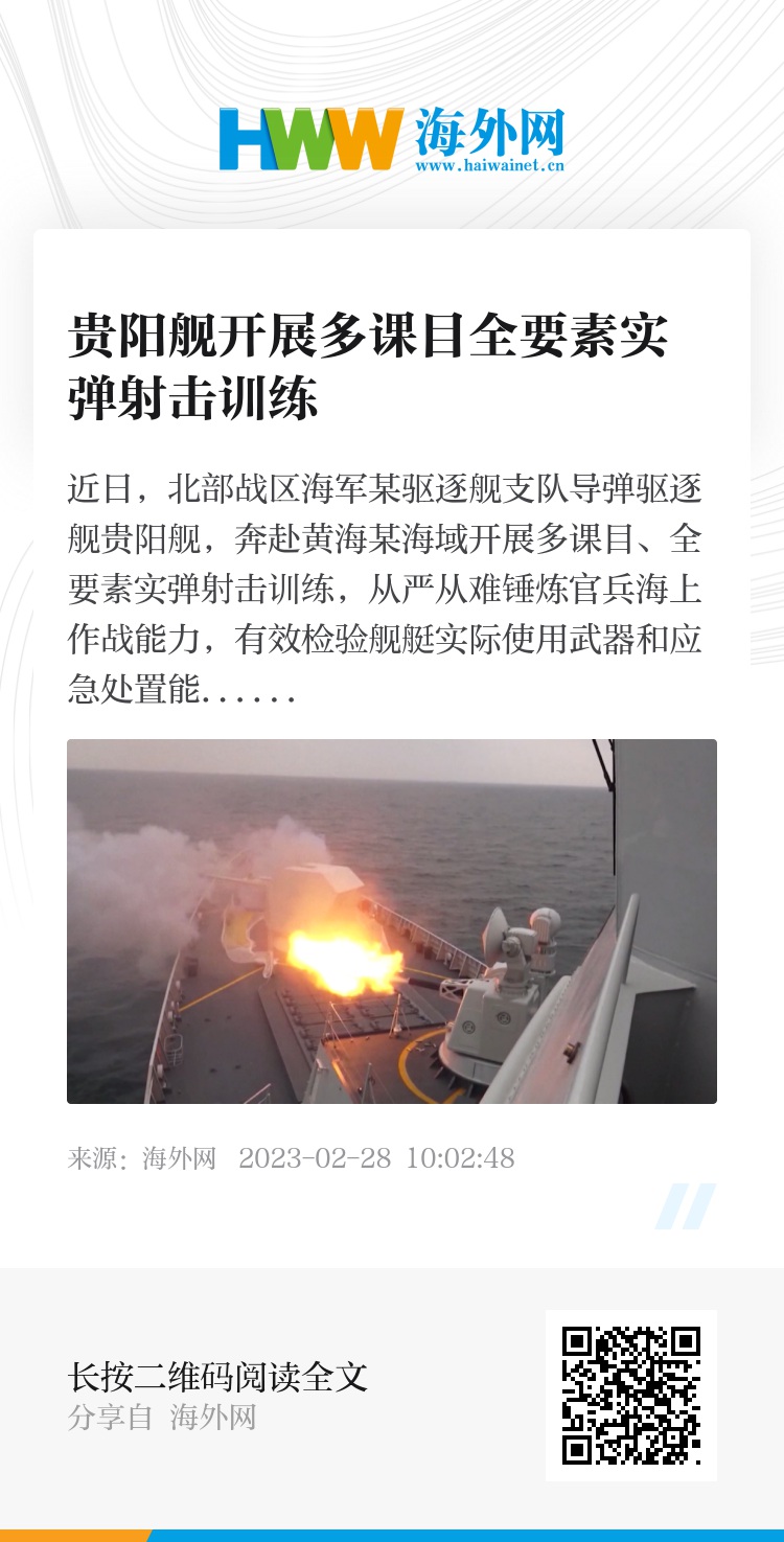 近日,北部战区海军某驱逐舰支队导弹驱逐舰贵阳舰,奔赴黄海某海域开展多课目、全要素实弹射击训练,从严从难锤炼官兵海上作战能力,有效检验舰艇实际使用武器和应急处置能力。在连续多天的训练中,贵阳舰瞄准作战需求,狠抓实战化练兵,重点检验舰艇装备性能和作战方案可行性,完善指挥流程和组织方法,不断提高武器平台协同水平。图片来源:CCTV+/视觉中国