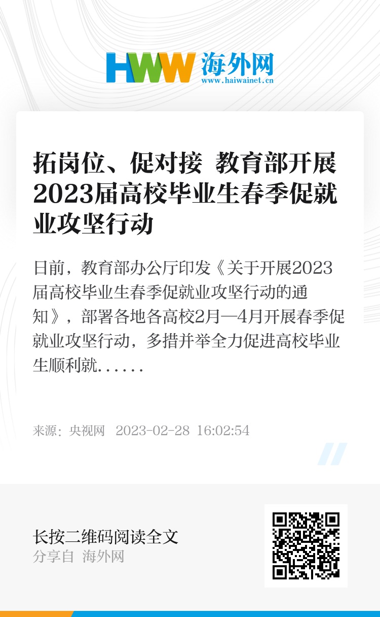 日前,教育部办公厅印发《关于开展2023届高校毕业生春季促就业攻坚行动的通知》,部署各地各高校2月—4月开展春季促就业攻坚行动,多措并举全力促进高校毕业生顺利就业、尽早就业。