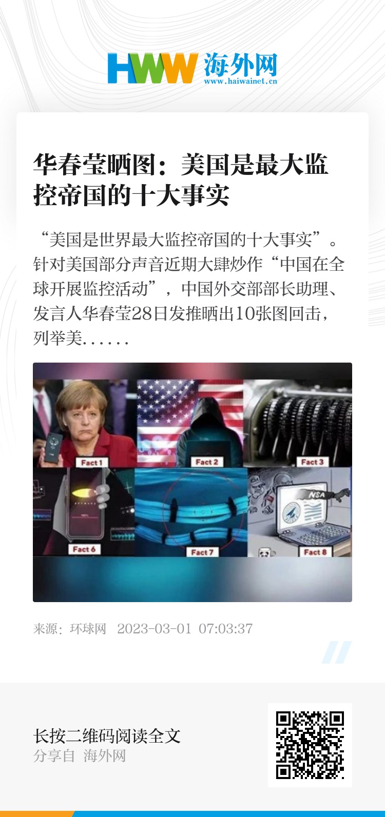 “美国是世界最大监控帝国的十大事实”。针对美国部分声音近期大肆炒作“中国在全球开展监控活动”,中国外交部部长助理、发言人华春莹28日发推晒出10张图回击,列举美国“才是世界上最大‘监控帝国’”一系列事实中的10个例证。
