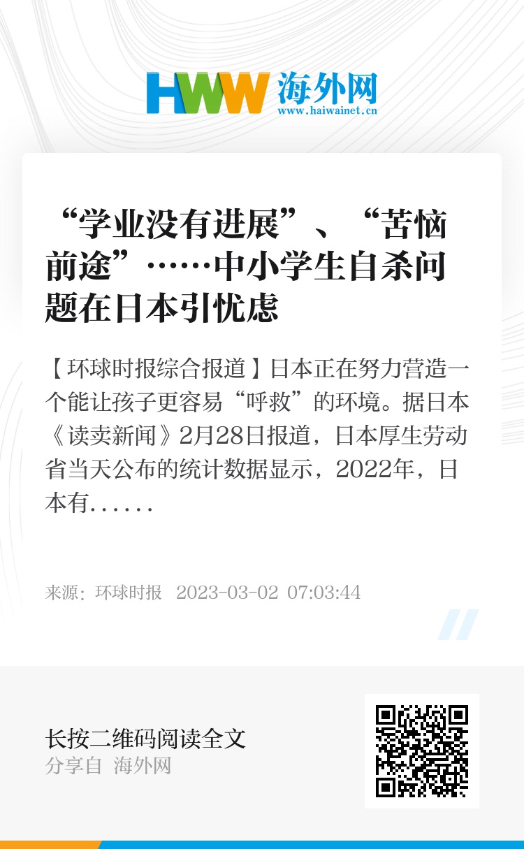 日本广播协会电视台3月1日报道称,面对2022年日本中小学生自杀人数创新高的问题,日本文部科学省2月28日向全国各地的教育委员会发出通知,要求尽早发现和帮助有烦恼和困难的孩子,并积极与家长合作。