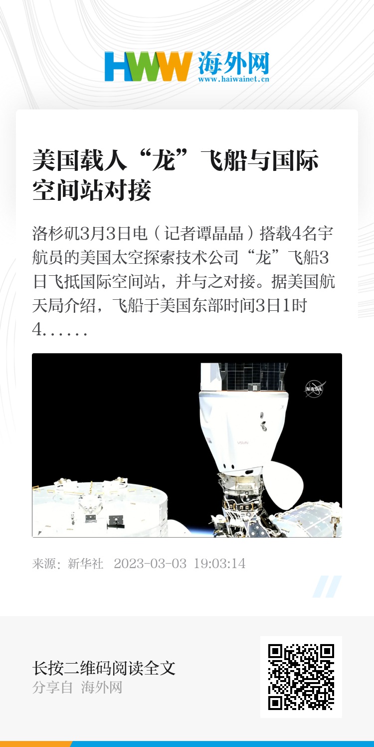 新华社洛杉矶3月3日电(记者谭晶晶)搭载4名宇航员的美国太空探索技术公司“龙”飞船3日飞抵国际空间站,并与之对接。