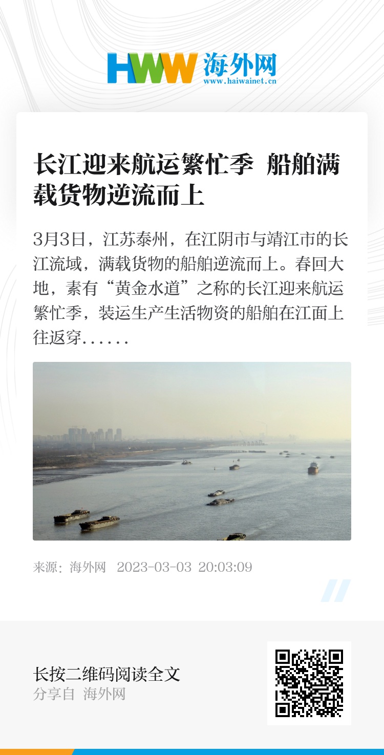 3月3日,江苏泰州,在江阴市与靖江市的长江流域,满载货物的船舶逆流而上。春回大地,素有“黄金水道”之称的长江迎来航运繁忙季,装运生产生活物资的船舶在江面上往返穿梭,有力保障工业生产和人们生活物资需求。图片来源:杨木军/视觉中国