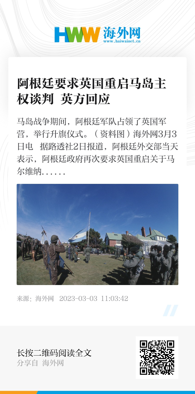 海外网3月3日电 据路透社2日报道,阿根廷外交部当天表示,阿根廷政府再次要求英国重启关于马尔维纳斯群岛(马岛,英国称福克兰群岛)主权归属的谈判。