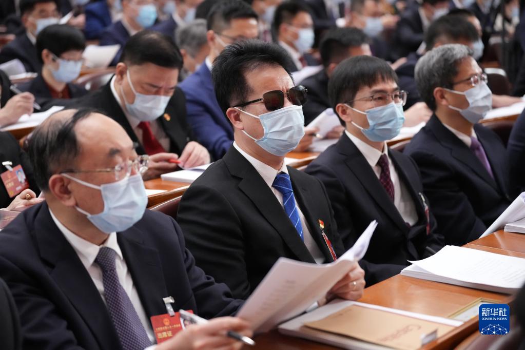 3月5日,第十四届全国人民代表大会第一次会议在北京人民大会堂开幕。来自福建的全国人大代表王永澄(前左二)是一位盲人,这是他在认真听会。