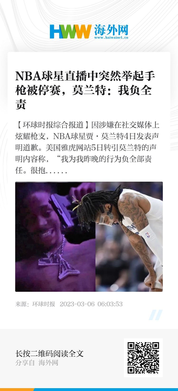 【环球时报综合报道】因涉嫌在社交媒体上炫耀枪支,NBA球星贾·莫兰特4日发表声明道歉。美国雅虎网站5日转引莫兰特的声明内容称,“我为我昨晚的行为负全部责任。很抱歉让我的家人、队友、教练、球迷、伙伴以及整个孟菲斯失望了。”