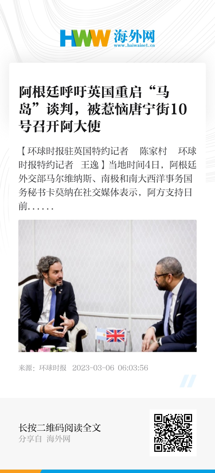 【环球时报驻英国特约记者 陈家村 环球时报特约记者 王逸】当地时间4日,阿根廷外交部马尔维纳斯、南极和南大西洋事务国务秘书卡莫纳在社交媒体表示,阿方支持日前联合国重申阿根廷与英国通过双方友好方式和平解决马尔维纳斯群岛(简称马岛,英国称福克兰群岛)主权归属问题的有关表态,呼吁两国重启马岛主权谈判。对此,英国方面一口回绝并表达强烈不满,摆出绝无谈判可能的架势。