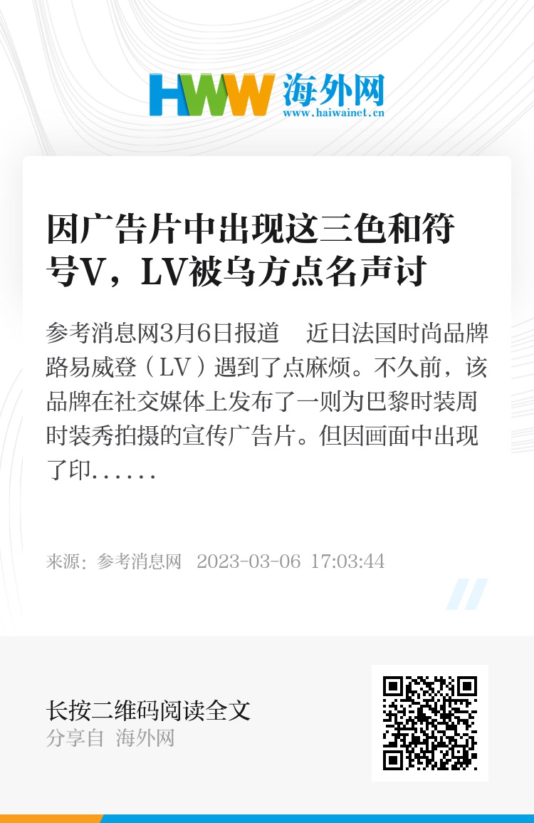 参考消息网3月6日报道 近日法国时尚品牌路易威登(LV)遇到了点麻烦。不久前,该品牌在社交媒体上发布了一则为巴黎时装周时装秀拍摄的宣传广告片。但因画面中出现了印有黑色符号V的蓝白红三色相间的旗帜,而遭到了一些海外网友的谴责,就连乌克兰总统泽连斯基的一名高级顾问也加入了声讨路易威登的行列。