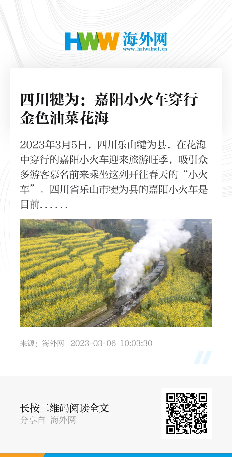 2023年3月5日,四川乐山犍为县,在花海中穿行的嘉阳小火车迎来旅游旺季,吸引众多游客慕名前来乘坐这列开往春天的“小火车”。四川省乐山市犍为县的嘉阳小火车是目前世界上为数不多的还在正常运行的客运窄轨蒸汽小火车,保留了蒸汽时代的加煤、制动、扳道等手动操作方式。图片来源:视觉中国