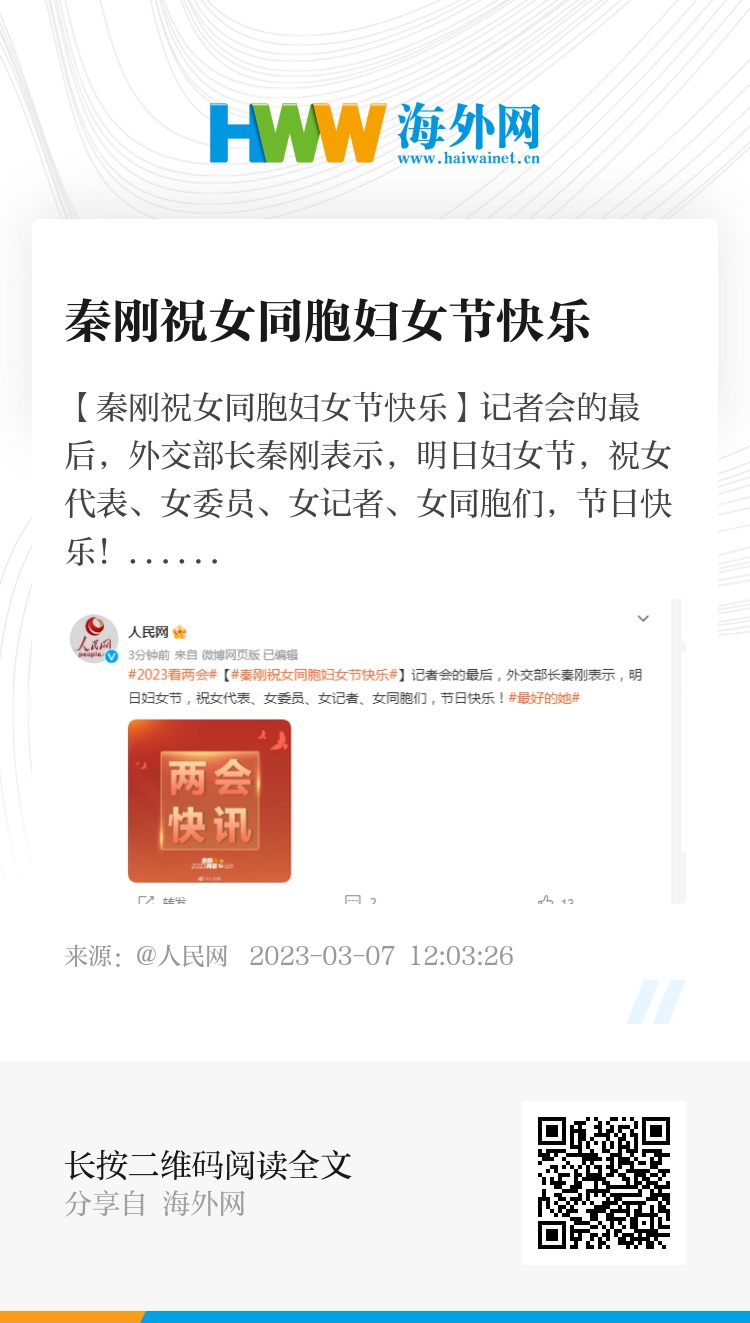 【秦刚祝女同胞妇女节快乐】记者会的最后,外交部长秦刚表示,明日妇女节,祝女代表、女委员、女记者、女同胞们,节日快乐!