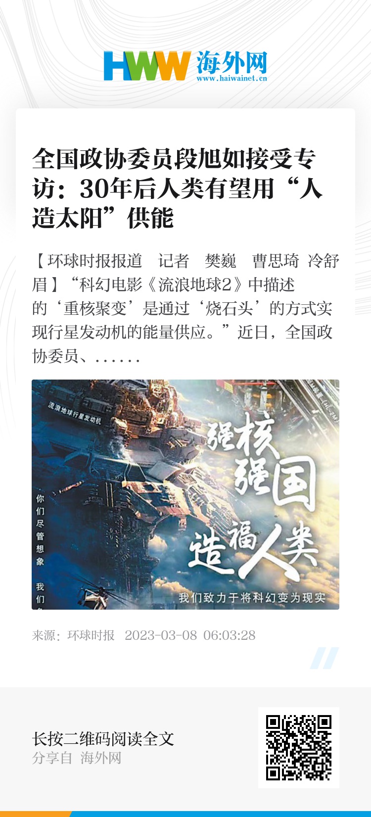【环球时报报道 记者 樊巍 曹思琦 冷舒眉】“科幻电影《流浪地球2》中描述的‘重核聚变’是通过‘烧石头’的方式实现行星发动机的能量供应。”近日,全国政协委员、中核集团核聚变领域首席专家段旭如在接受《环球时报》记者专访时表示,从当前工程角度来讲,“重核聚变”暂时还不属于重点研究方向,然而现实世界人类利用轻核聚变实现聚变能源的利用指日可待。