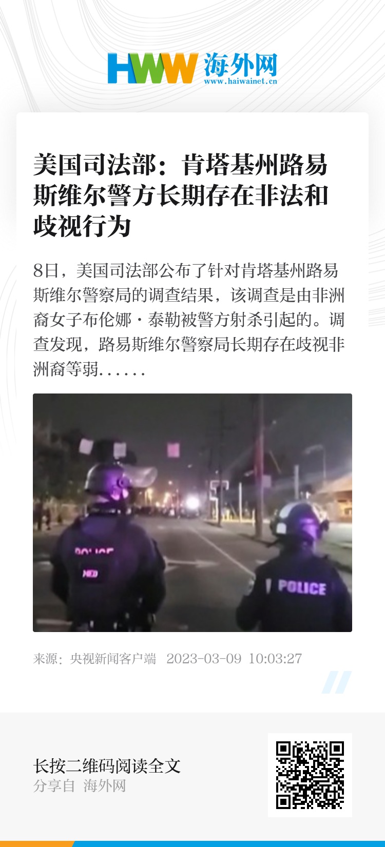 8日,美国司法部公布了针对肯塔基州路易斯维尔警察局的调查结果,该调查是由非洲裔女子布伦娜·泰勒被警方射杀引起的。调查发现,路易斯维尔警察局长期存在歧视非洲裔等弱势群体和过度使用武力等不当行为。