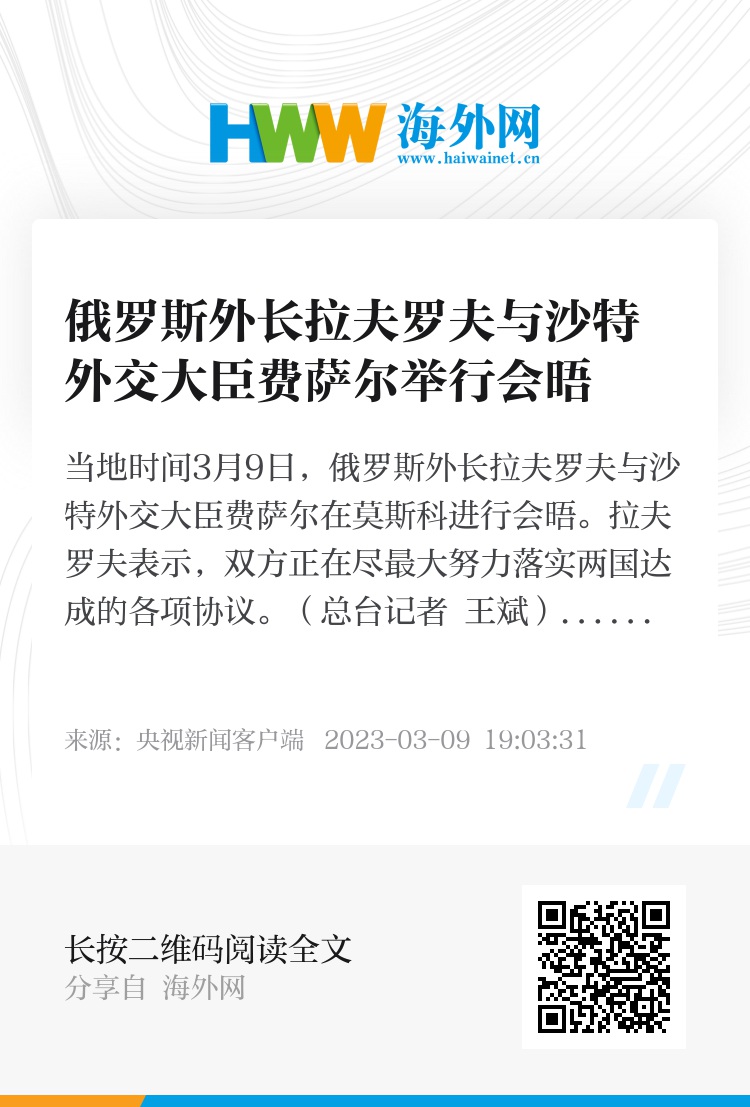 当地时间3月9日,俄罗斯外长拉夫罗夫与沙特外交大臣费萨尔在莫斯科进行会晤。拉夫罗夫表示,双方正在尽最大努力落实两国达成的各项协议。(总台记者 王斌)