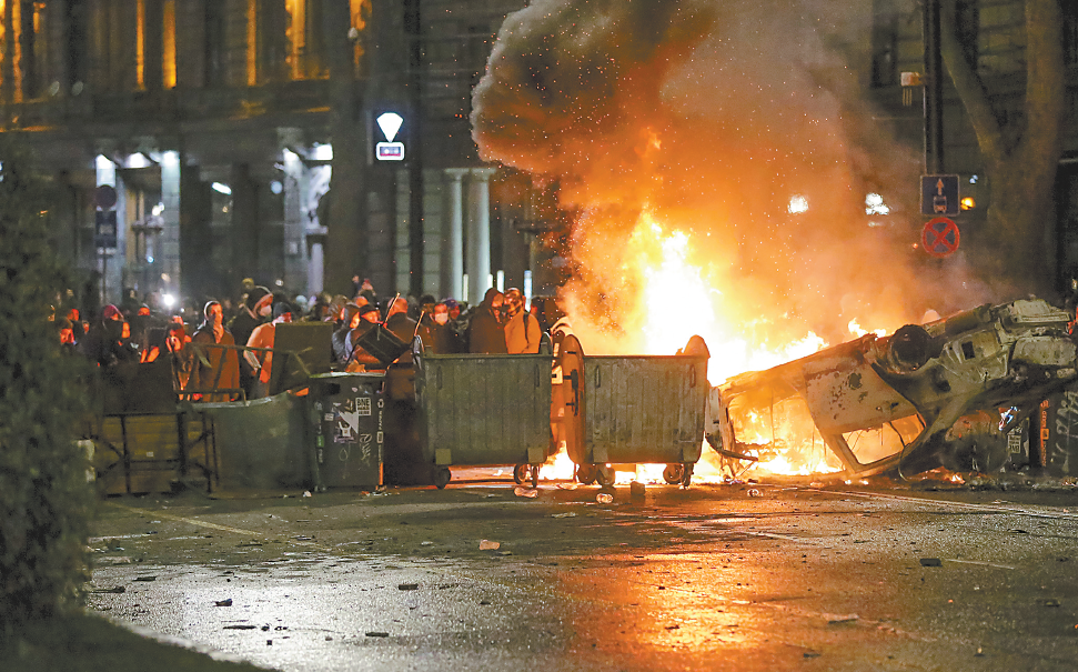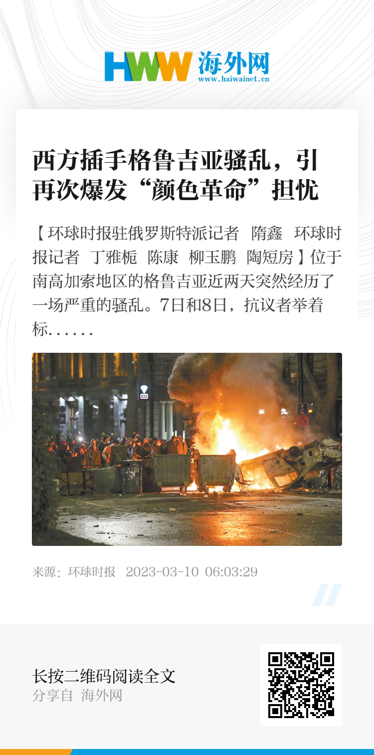 【环球时报驻俄罗斯特派记者 隋鑫 环球时报记者 丁雅栀 陈康 柳玉鹏 陶短房】位于南高加索地区的格鲁吉亚近两天突然经历了一场严重的骚乱。7日和8日,抗议者举着标语,挥舞着美国、欧盟和乌克兰国旗,数次冲击格鲁吉亚议会,以抗议议会此前通过的《外国代理人法》。尽管格鲁吉亚政府和执政党表示该法是仿效美国的类似法案,但曾经把本国冲击议会行为称为“暴乱”的美国和欧洲等西方国家却公开支持抗议者,声称法案“受克里姆林宫启发”,并威胁对格政府和执政党进行制裁。今年是格鲁吉亚爆发“玫瑰革命”20周年,不少分析担忧格可能再次爆发“颜色革命”。俄《观点报》9日引述俄联邦委员会(议会上院)议员克里莫夫的话称,格鲁吉亚正在进行一次“独立的考试”。“如果它有真正的主权,它必须捍卫自己的独立。如果考试失败,格鲁吉亚有可能成为第二个乌克兰”。