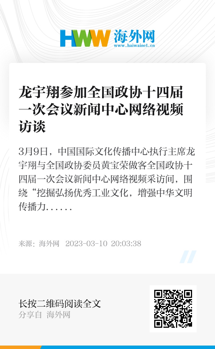 3月9日,中国国际文化传播中心执行主席龙宇翔与全国政协委员黄宝荣做客全国政协十四届一次会议新闻中心网络视频采访间,围绕“挖掘弘扬优秀工业文化,增强中华文明传播力影响力”访谈主题,进行了深入的沟通交流。