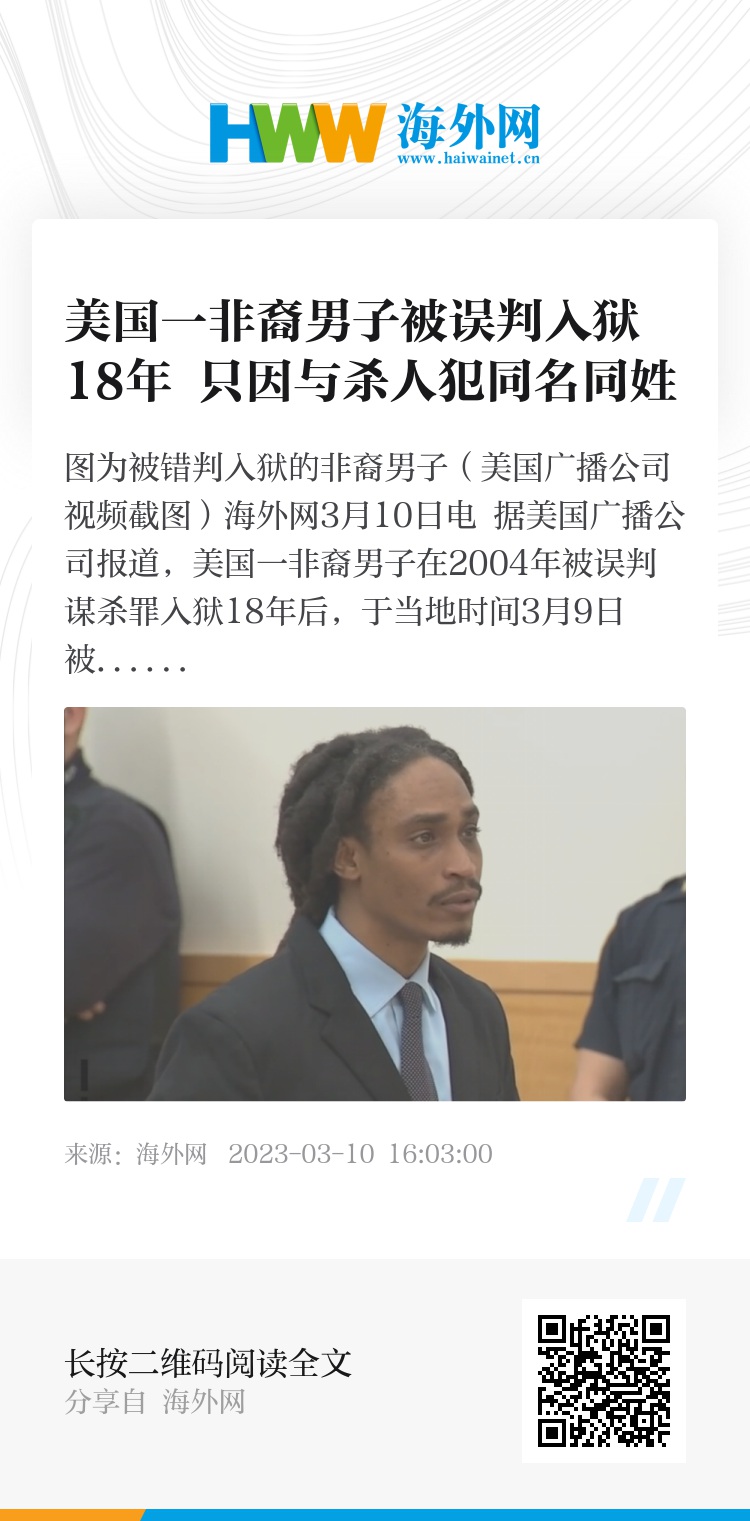 海外网3月10日电 据美国广播公司报道,美国一非裔男子在2004年被误判谋杀罪入狱18年后,于当地时间3月9日被无罪释放。