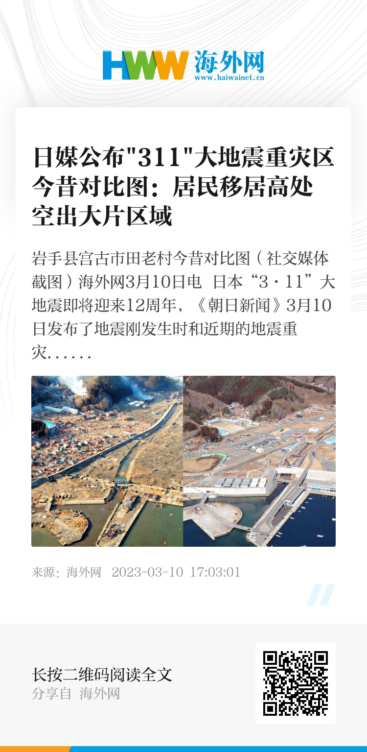 《朝日新闻》称,如今的重灾区最新照片都拍摄于2023年3月5日,希望读者都能够通过受灾地区的今昔对比,反思如何对灾区进行复兴重建。(海外网/王珊宁)