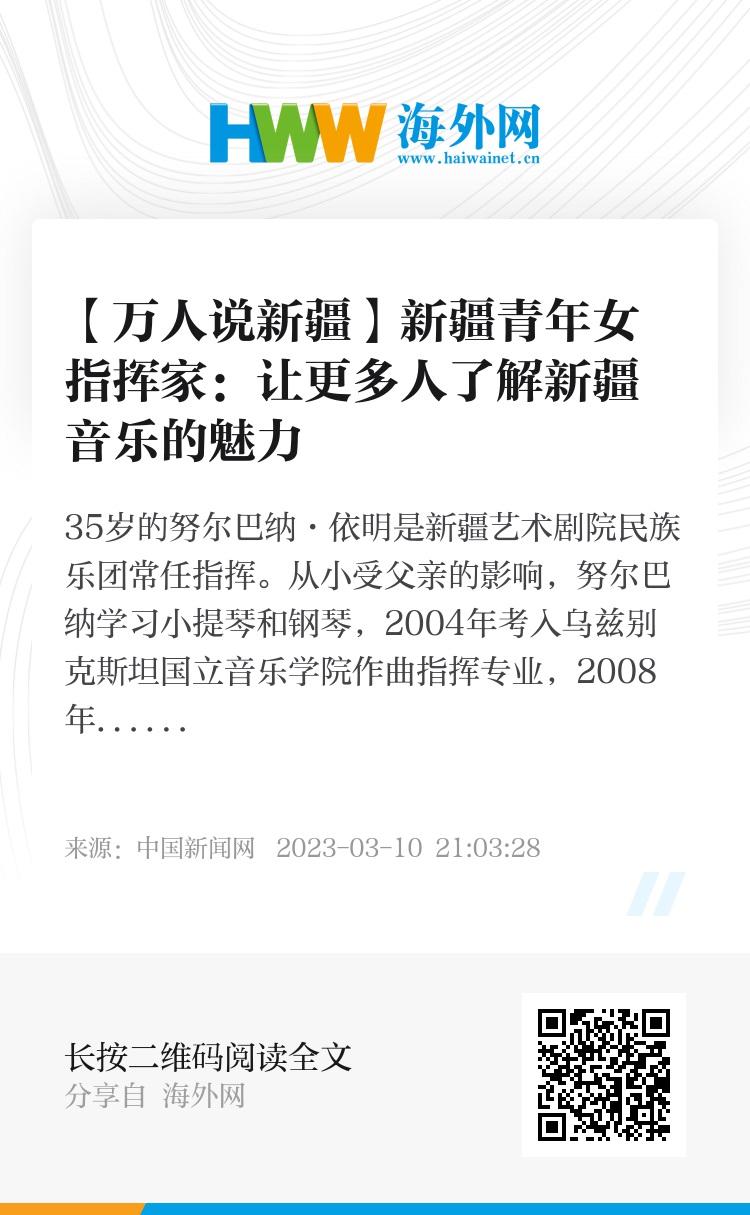 35岁的努尔巴纳·依明是新疆艺术剧院民族乐团常任指挥。从小受父亲的影响,努尔巴纳学习小提琴和钢琴,2004年考入乌兹别克斯坦国立音乐学院作曲指挥专业,2008年考入该学院的歌剧交响乐指挥专业。毕业后,巴纳怀揣着对新疆这片土地的热爱和新疆民乐发展的期待,回到新疆艺术剧院民族乐团担任常任指挥。