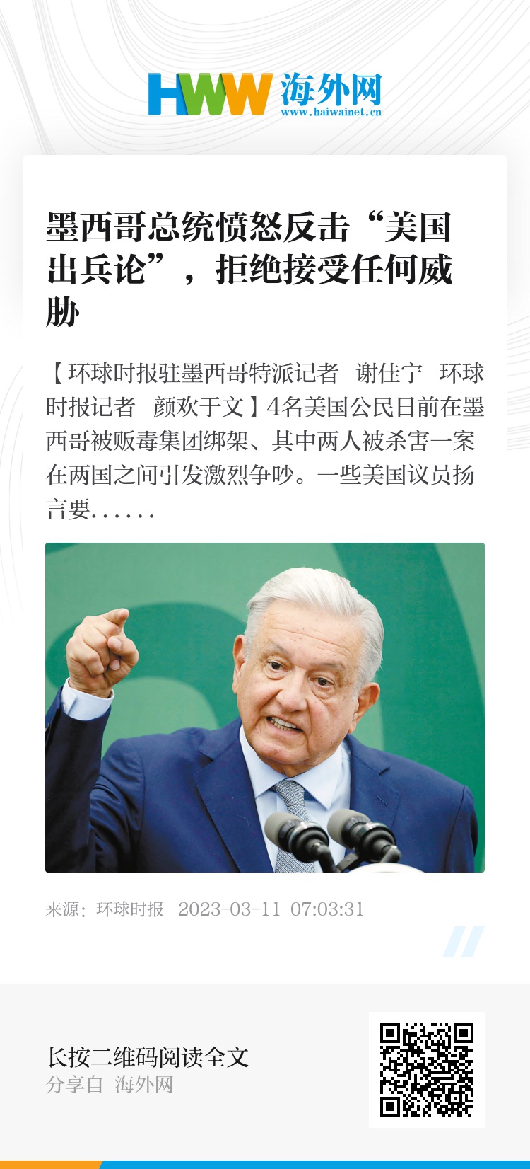 路透社9日报道称,墨西哥总统洛佩斯当天在新闻发布会上表示,他的政府“不会允许任何外国政府干预我们领土(发生的事),更不用说外国的武装部队”。“我们不是美国的受保护国,也不是美国的殖民地,”洛佩斯说,“墨西哥是一个自由、独立的主权国家。”