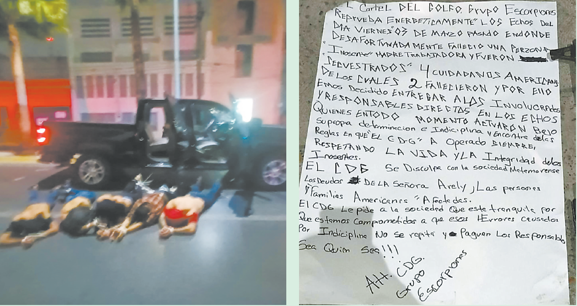 当地时间9日凌晨,在绑架案发生的墨西哥马塔莫罗斯市,5名男子被发现被丢弃在一条街道上,他们双手被绑,衬衫套在头上,胸部赤裸,附近有一张用黑笔书写、包含错字的纸条:“我们决定交出那些在任何时候都按照自己的自由意志行事的参与者和直接责任人。”美国有线电视新闻网(CNN)称,网上发布的照片显示,5名男子脸朝下躺在人行道上,旁边站着身穿制服的执法人员。“道歉信”还说,蝎子集团向马塔莫罗斯社会、在上周枪战中遇害的一名墨西哥公民家属以及受影响的美国人民和家庭道歉,“我们强烈谴责上周五发生的事件,决定移交那些直接参与这次行动的人,他们违反了本集团一贯的运作规则”。