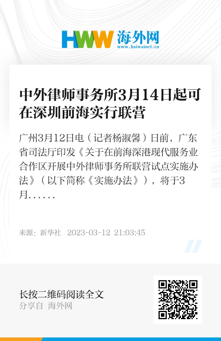 新华社广州3月12日电(记者杨淑馨)日前,广东省司法厅印发《关于在前海深港现代服务业合作区开展中外律师事务所联营试点实施办法》(以下简称《实施办法》),将于3月14日正式实施。