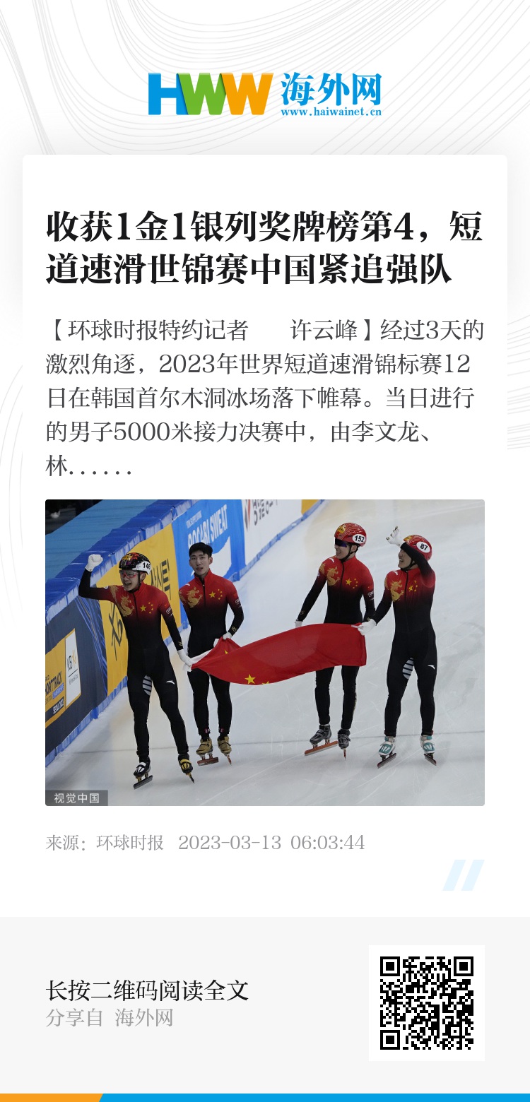 【环球时报特约记者 许云峰】经过3天的激烈角逐,2023年世界短道速滑锦标赛12日在韩国首尔木洞冰场落下帷幕。当日进行的男子5000米接力决赛中,由李文龙、林孝埈、刘冠逸和钟宇晨组成的中国队以7分04秒412的成绩夺得冠军,夺金后的林孝埈跪在冰面上庆祝。稍早前结束的混合2000米接力决赛,由公俐、李文龙、林孝埈和臧一泽代表中国队获得该项目银牌。