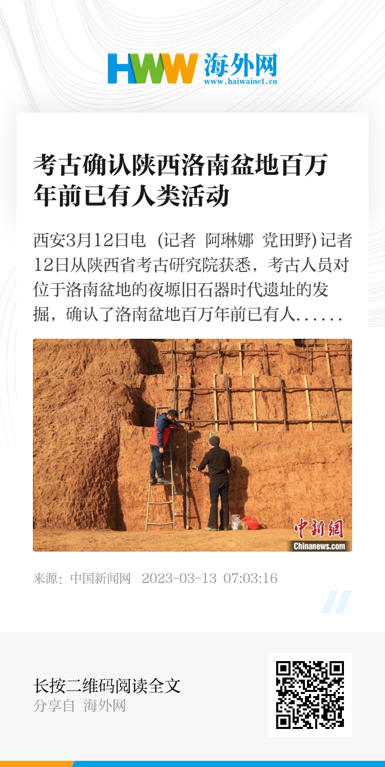 中新网西安3月12日电 (记者 阿琳娜 党田野)记者12日从陕西省考古研究院获悉,考古人员对位于洛南盆地的夜塬旧石器时代遗址的发掘,确认了洛南盆地百万年前已有人类活动,该盆地成为中国为数不多的存在百万年前人类活动信息的重要地区之一,对研究中国远古人类与文化的起源与早期发展具有重要意义。