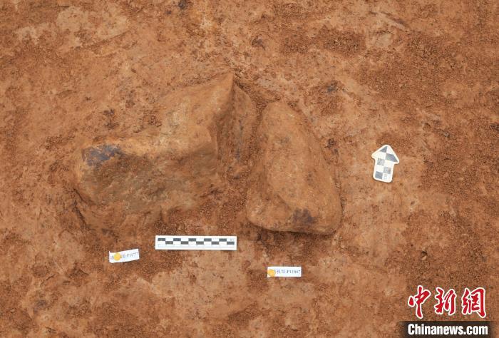 洛南夜塬遗址第11层原位埋藏的单面修理手镐。 陕西省考古研究院供图