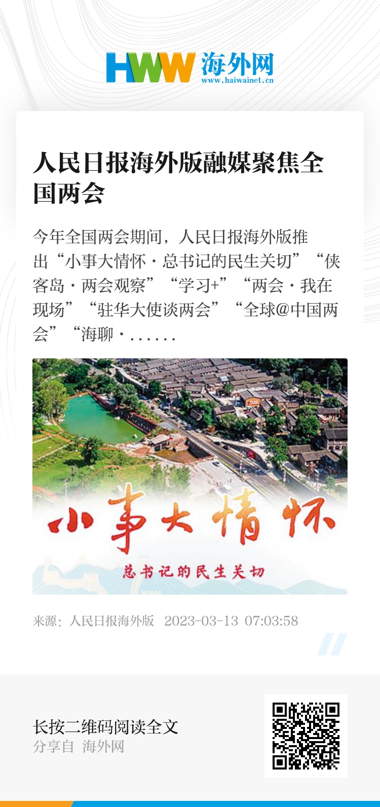 今年全国两会期间,人民日报海外版推出“小事大情怀·总书记的民生关切”“侠客岛·两会观察”“学习+”“两会·我在现场”“驻华大使谈两会”“全球@中国两会”“海聊·全国两会特辑”等融媒体产品。其中,“学习小组”融媒体工作室发布的“小事大情怀·总书记的民生关切”系列融媒体报道被全网推送,总阅读量近1亿次。