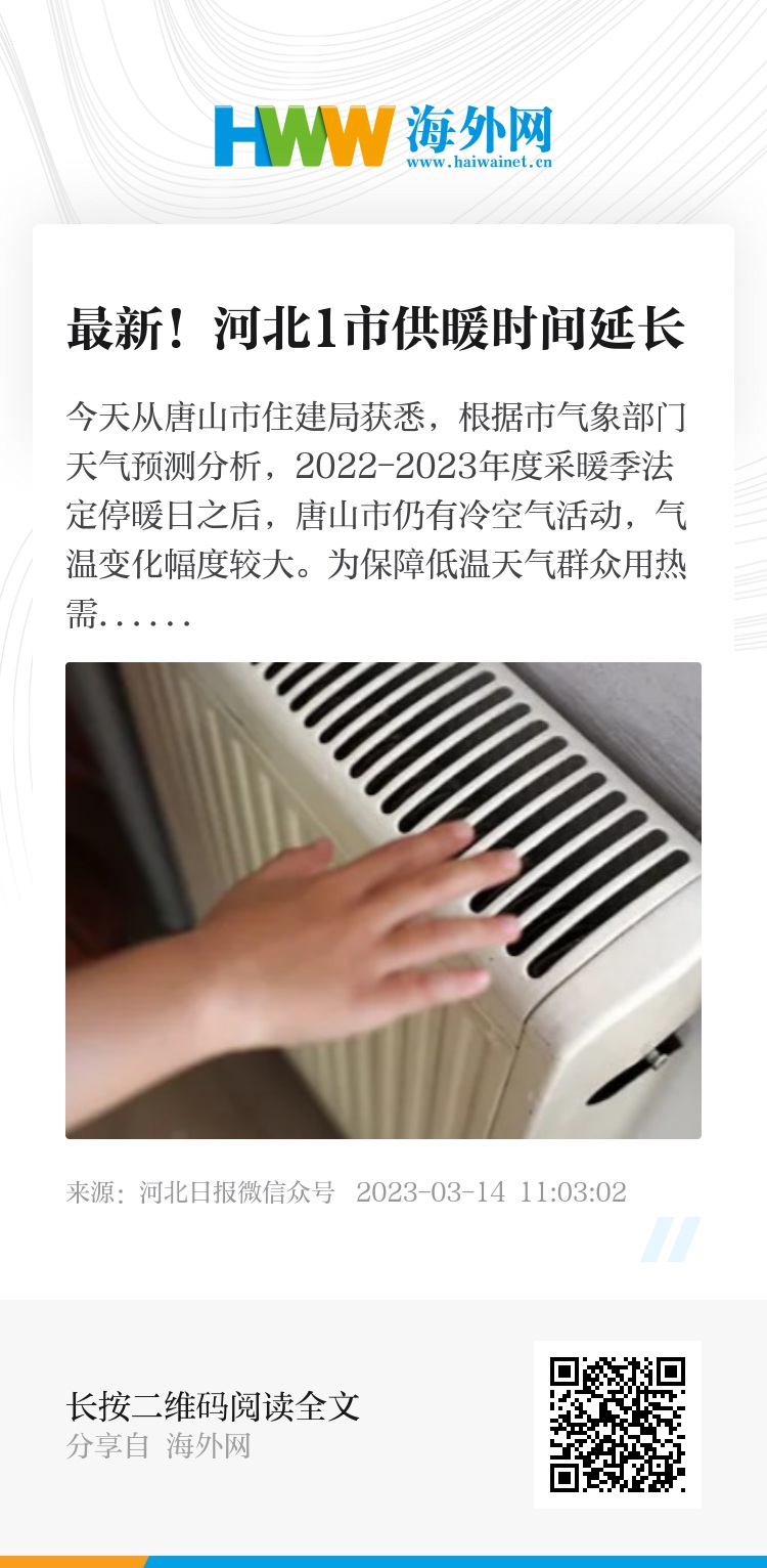 据了解,3月13日,唐山市委办公室、市政府办公室印发了《关于2022-2023年度采暖季延长供暖时间的通知》(以下简称《通知》)。《通知》明确,唐山市今冬采暖季延长供暖时间至3月22日24时,同时要求,各县(市、区)供热主管部门要督促供热企业严格落实通知要求,严防发生擅自停暖或惜供现象。指导供热企业加强供热设施巡检巡查,及时发现并解决热源、热网、换热站等供热基础设施存在的故障问题和安全隐患,确保延长供暖期间供热稳定,群众居家温暖舒适。相关部门单位将做好强化能源保障,密切关注天气变化情况等工作。