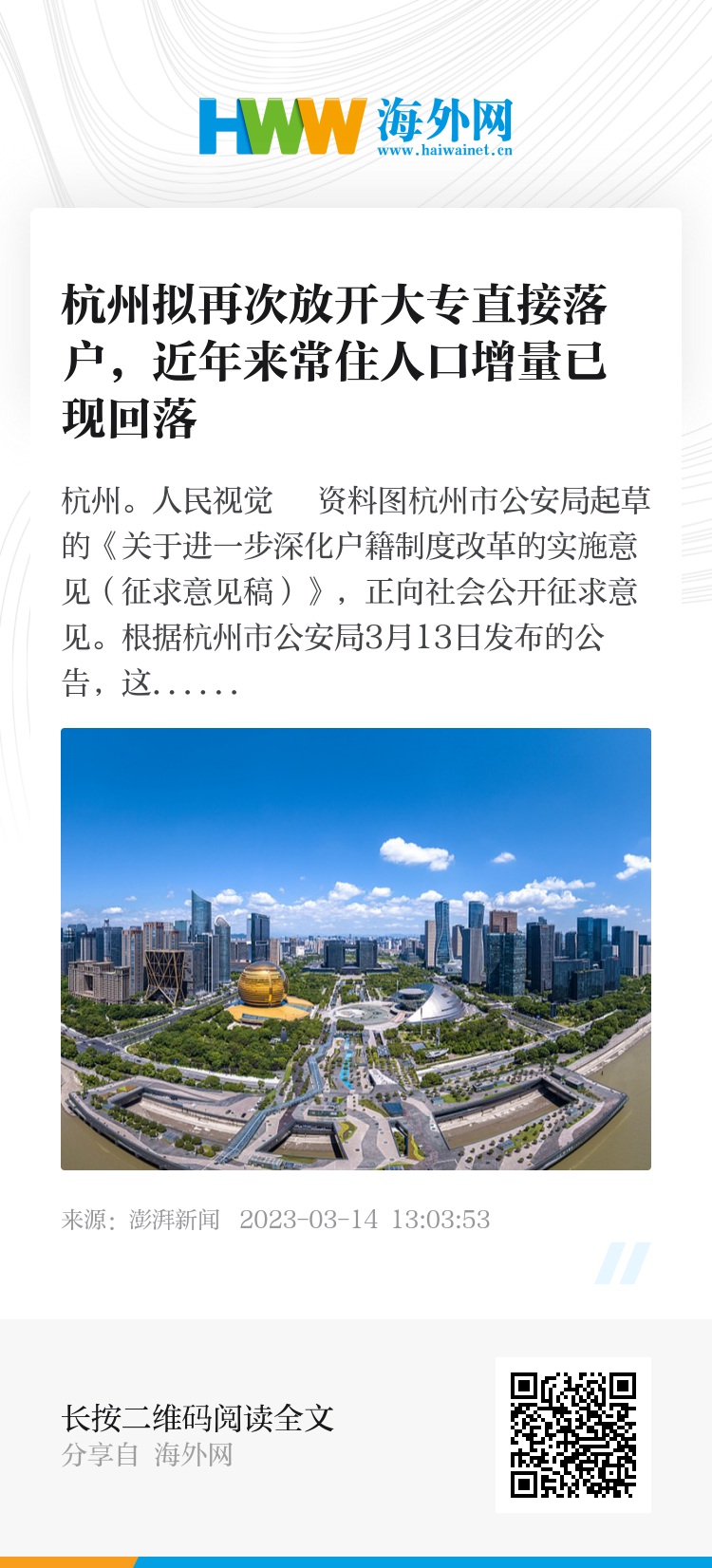 根据杭州市公安局3月13日发布的公告,这是为深入贯彻党的二十大精神,推动劳动力要素合理畅通有序流动,加快农业转移人口市民化,高质量发展建设共同富裕示范区,进一步放宽落户政策,统筹推进户籍制度改革。