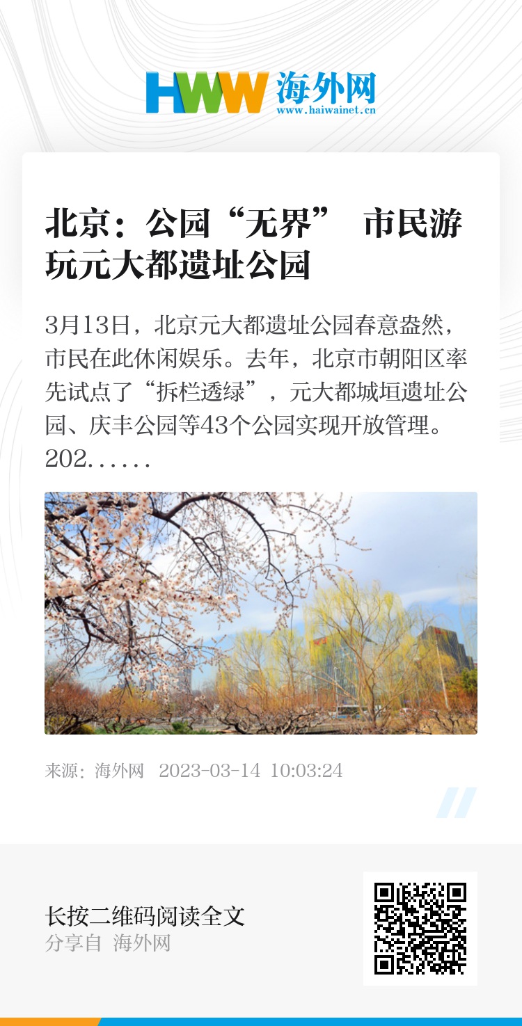 3月13日,北京元大都遗址公园春意盎然,市民在此休闲娱乐。去年,北京市朝阳区率先试点了“拆栏透绿”,元大都城垣遗址公园、庆丰公园等43个公园实现开放管理。2023年,北京将全面推进“无界公园”建设,因地制宜拆除20家公园围栏、围挡,增加步道、文体等便民设施,促进公园绿地与城市空间有机融合。图片来源:视觉中国