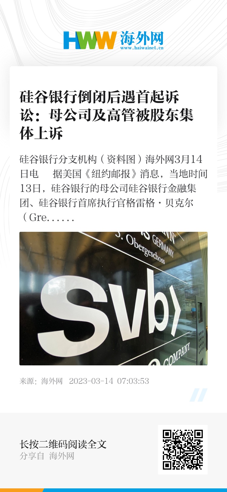 海外网3月14日电 据美国《纽约邮报》消息,当地时间13日,硅谷银行的母公司硅谷银行金融集团、硅谷银行首席执行官格雷格·贝克尔(Greg Becker)、硅谷银行首席财务官丹尼尔·贝克(Daniel Beck)被股东提出集体诉讼。