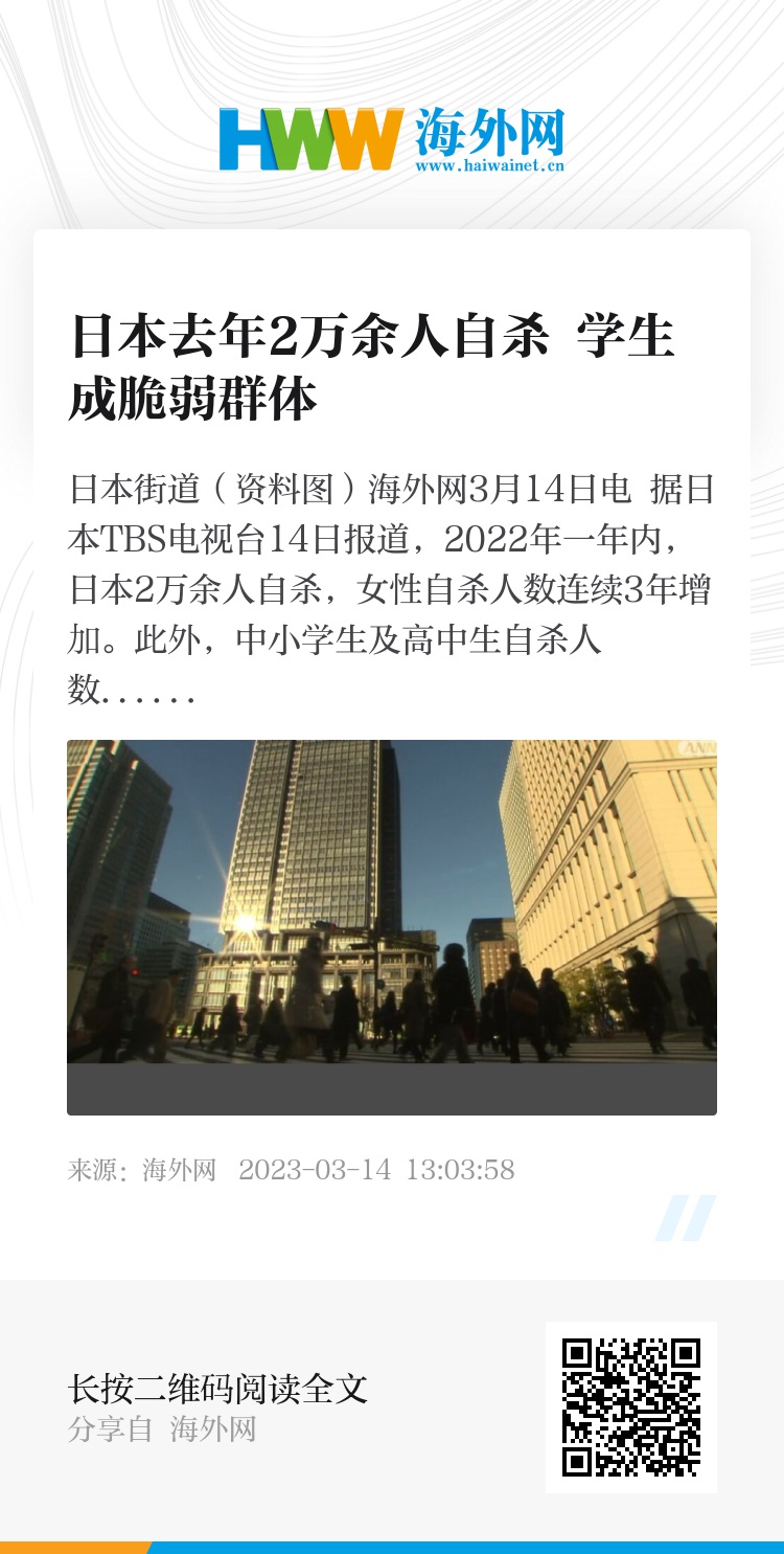 海外网3月14日电 据日本TBS电视台14日报道,2022年一年内,日本2万余人自杀,女性自杀人数连续3年增加。此外,中小学生及高中生自杀人数超过500人,创最高纪录。
