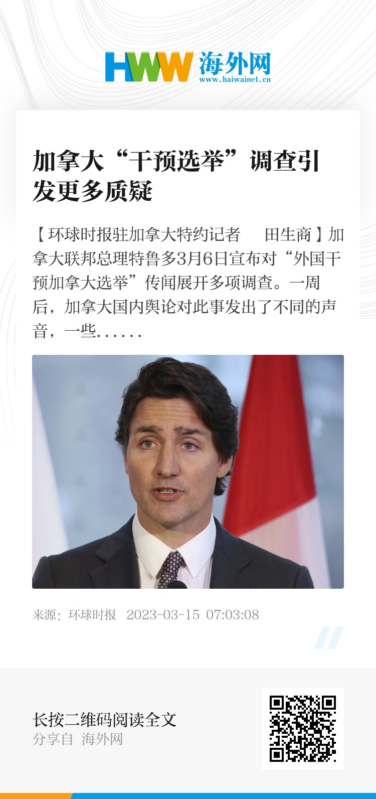 【环球时报驻加拿大特约记者 田生商】加拿大联邦总理特鲁多3月6日宣布对“外国干预加拿大选举”传闻展开多项调查。一周后,加拿大国内舆论对此事发出了不同的声音,一些人直言,不公正的调查令人反感。3月13日,卡塔尔半岛电视台专栏作家米特罗维察发表文章,对加拿大安全情报局(CSIS)的工作作风提出尖锐批评。