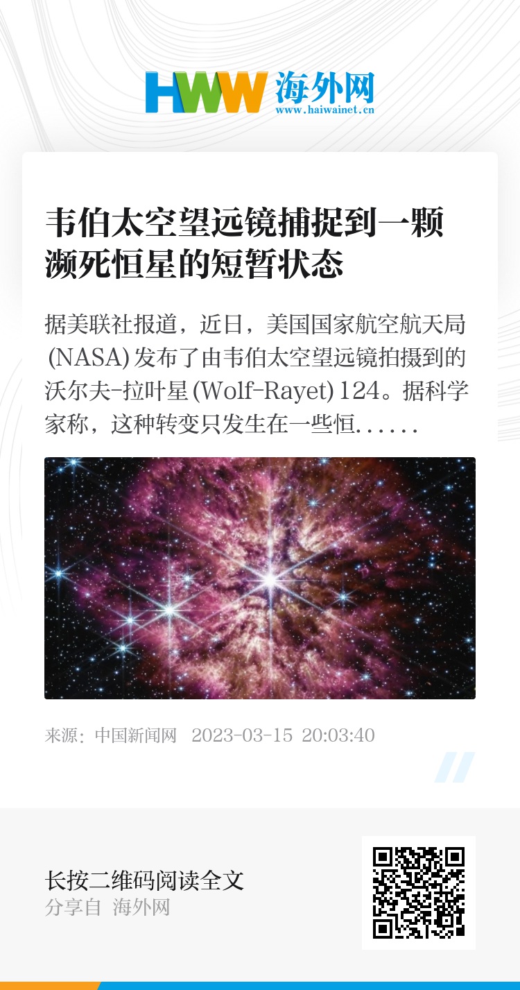 据美联社报道,近日,美国国家航空航天局(NASA)发布了由韦伯太空望远镜拍摄到的沃尔夫-拉叶星(Wolf-Rayet)124。据科学家称,这种转变只发生在一些恒星上,通常是它们爆炸成为超新星之前的最后一步。