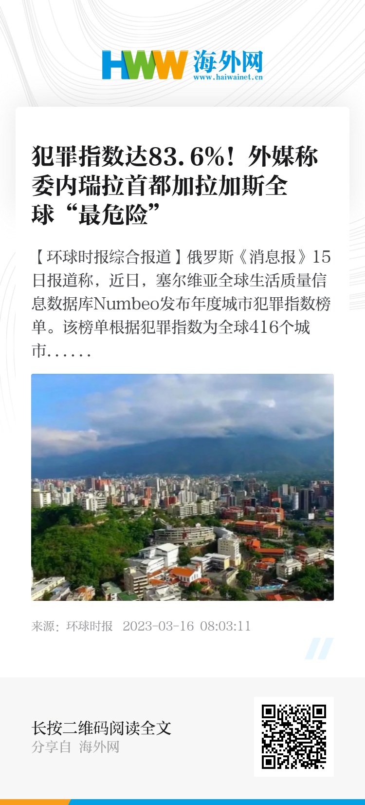 【环球时报综合报道】俄罗斯《消息报》15日报道称,近日,塞尔维亚全球生活质量信息数据库Numbeo发布年度城市犯罪指数榜单。该榜单根据犯罪指数为全球416个城市进行了排名,委内瑞拉首都加拉加斯的犯罪指数最高,为83.6%。