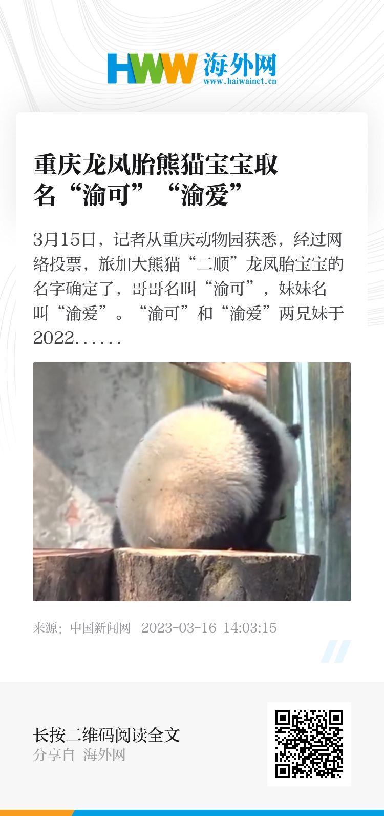 3月15日,记者从重庆动物园获悉,经过网络投票,旅加大熊猫“二顺”龙凤胎宝宝的名字确定了,哥哥名叫“渝可”,妹妹名叫“渝爱”。“渝可”和“渝爱”两兄妹于2022年7月22日出生,哥哥初生体重132克,妹妹初生体重91克,在重庆动物园饲养员悉心照顾下茁壮成长。大熊猫妈妈“二顺”,2007年8月10日出生,曾作为友好使者,从2013年3月起旅居加拿大多伦多动物园和卡尔加里动物园,2020年11月底回国。
