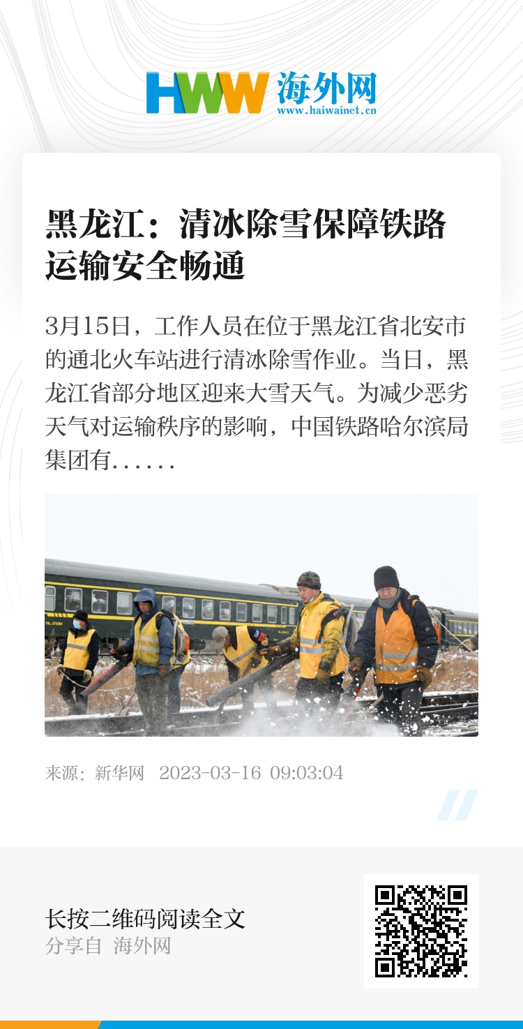 3月15日,工作人员在位于黑龙江省北安市的通北火车站进行清冰除雪作业。当日,黑龙江省部分地区迎来大雪天气。为减少恶劣天气对运输秩序的影响,中国铁路哈尔滨局集团有限公司启动应急预案,组织干部职工备勤除雪,有序开展行车调度、清冰除雪、设备巡检、旅客疏导等应急处置工作,保障极端天气下的铁路运输安全畅通。新华社记者 王松 摄