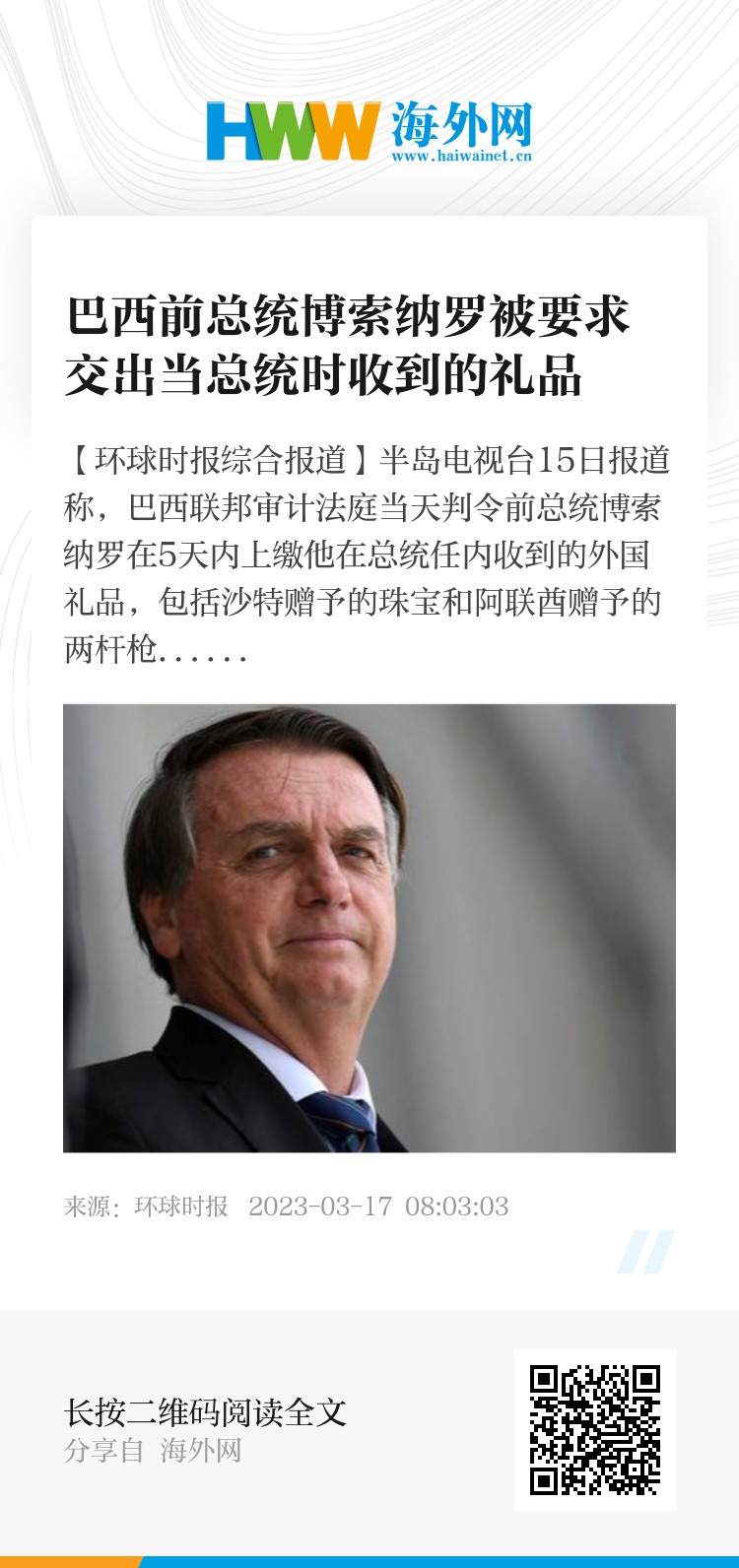 【环球时报综合报道】半岛电视台15日报道称,巴西联邦审计法庭当天判令前总统博索纳罗在5天内上缴他在总统任内收到的外国礼品,包括沙特赠予的珠宝和阿联酋赠予的两杆枪,同时还要求对其任期内收到的所有官方礼品展开审计。