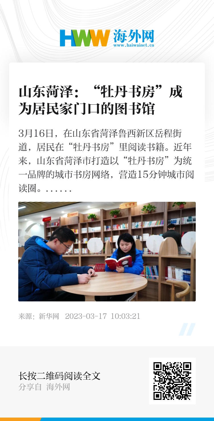 近年来,山东省菏泽市打造以“牡丹书房”为统一品牌的城市书房网络,营造15分钟城市阅读圈。
