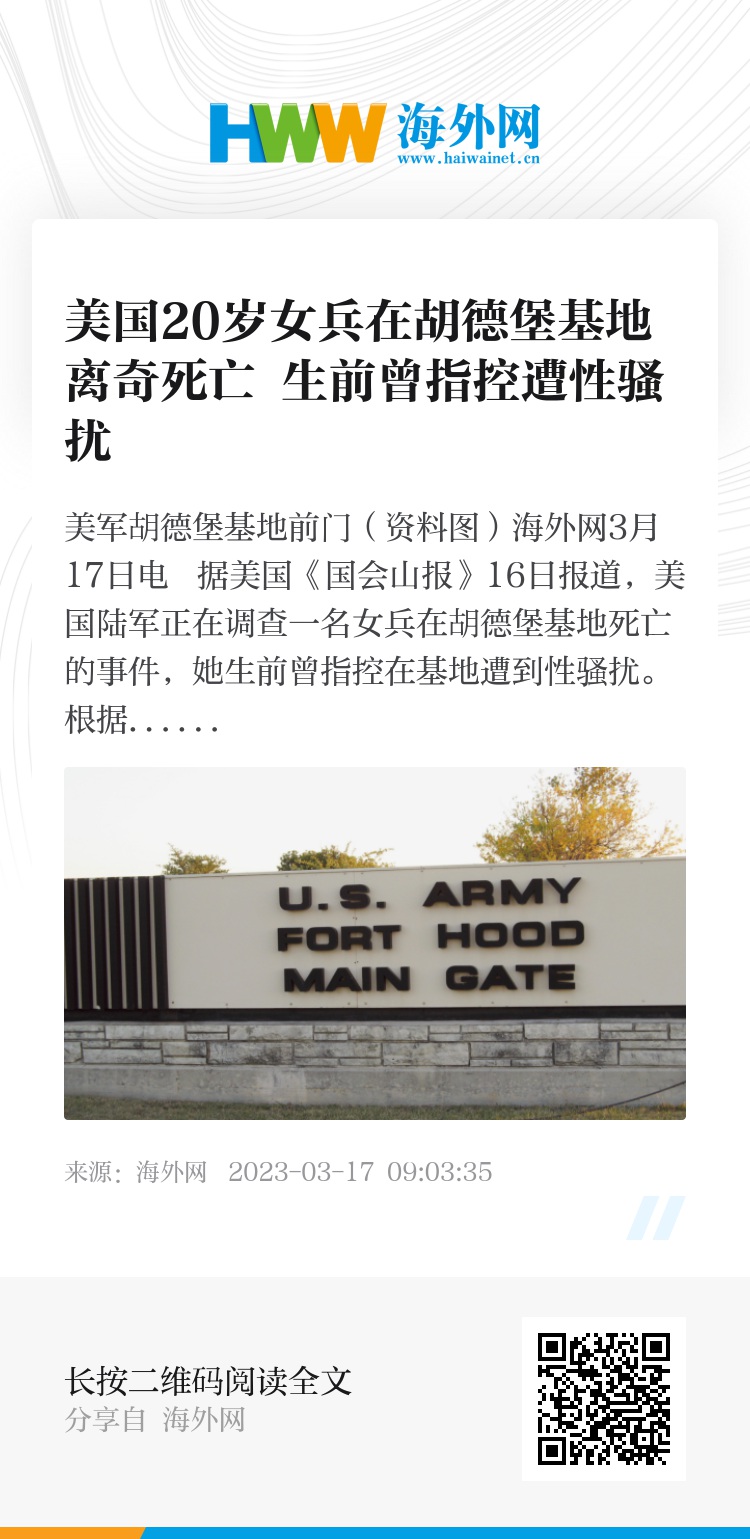 海外网3月17日电 据美国《国会山报》16日报道,美国陆军正在调查一名女兵在胡德堡基地死亡的事件,她生前曾指控在基地遭到性骚扰。